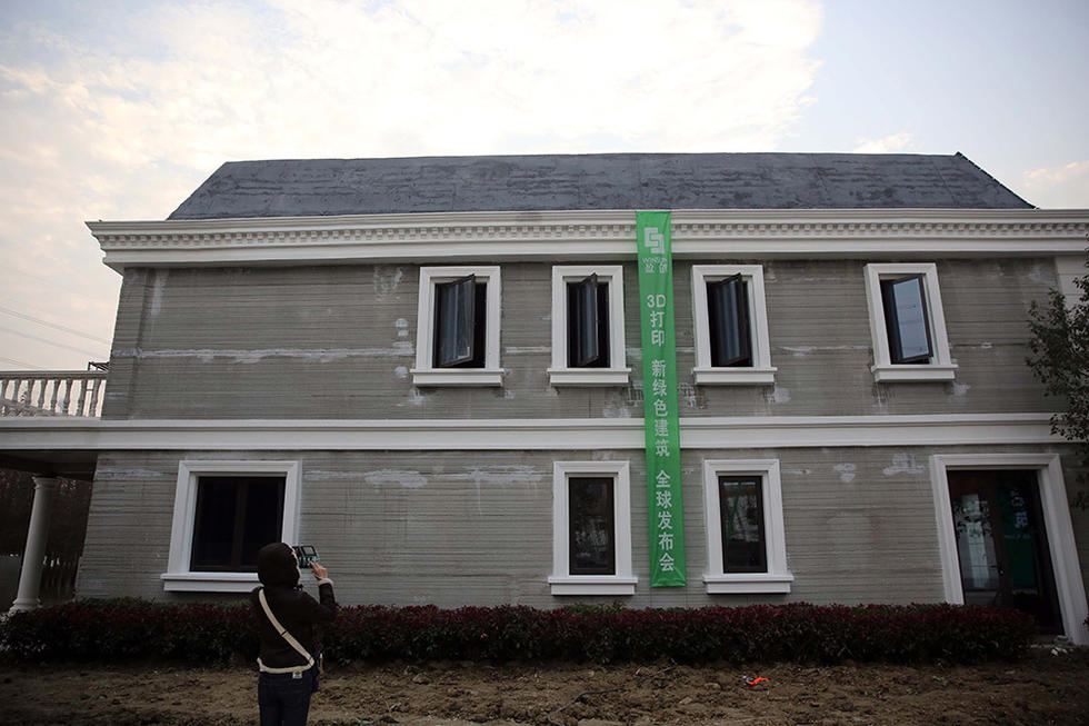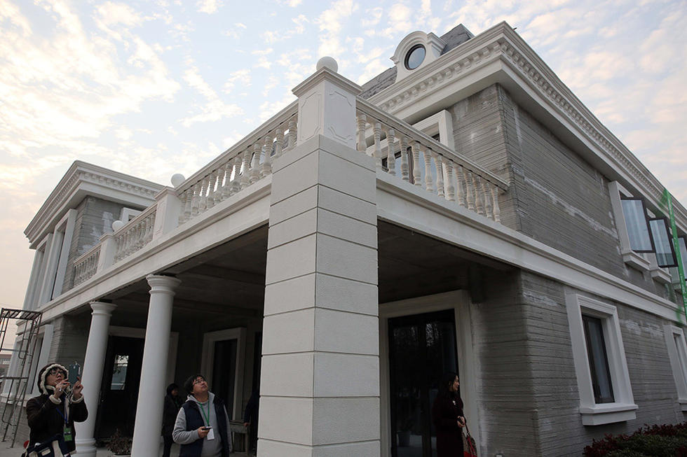 就在昨天1月18日,兩名行人從3D打印制成的別墅旁經(jīng)過。數(shù)幢使用3D打印技術建造的建筑亮相蘇州工業(yè)園區(qū)。這批建筑包括一棟面積1100平米的別墅和一棟6層居民樓。這些建筑的墻體由大型3D打印機層層疊加噴繪而成,而打印使用的“油墨”則由建筑垃圾制成。